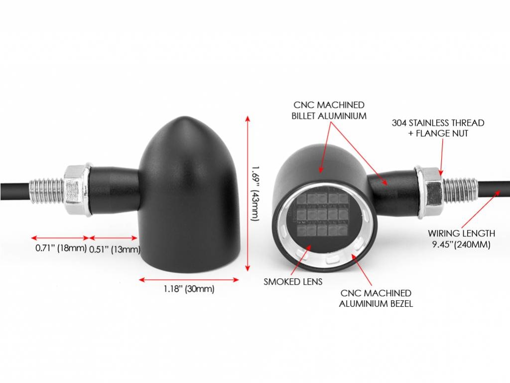 Diese hochwertigen Blinker sind aus massivem 6061 Billet Aluminium gefertigt. Intern sind sie mit zwei intensiven hellen LEDs mit einer getönten Linse ausgestattet. Sie sind super klein und super hell.