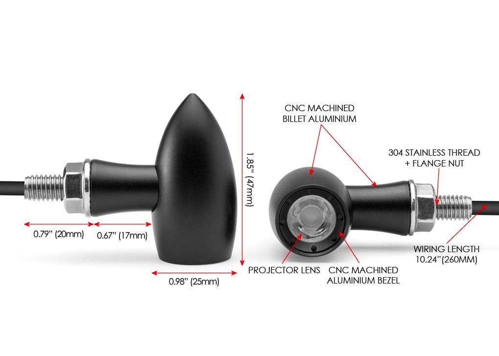 Diese hochwertigen Indikatoren sind aus massivem 6061 Billet Aluminium gefertigt. Intern verfügen sie über einen sehr hellen, leistungsstarken, gelben CREE-LED-Chip mit einer Projektorlinse. Sie sind auch sehr klein und diskret und werden wählerischen Käufern auf der Suche nach hochwertigen Indikatoren zu einem erschwinglichen Preis.