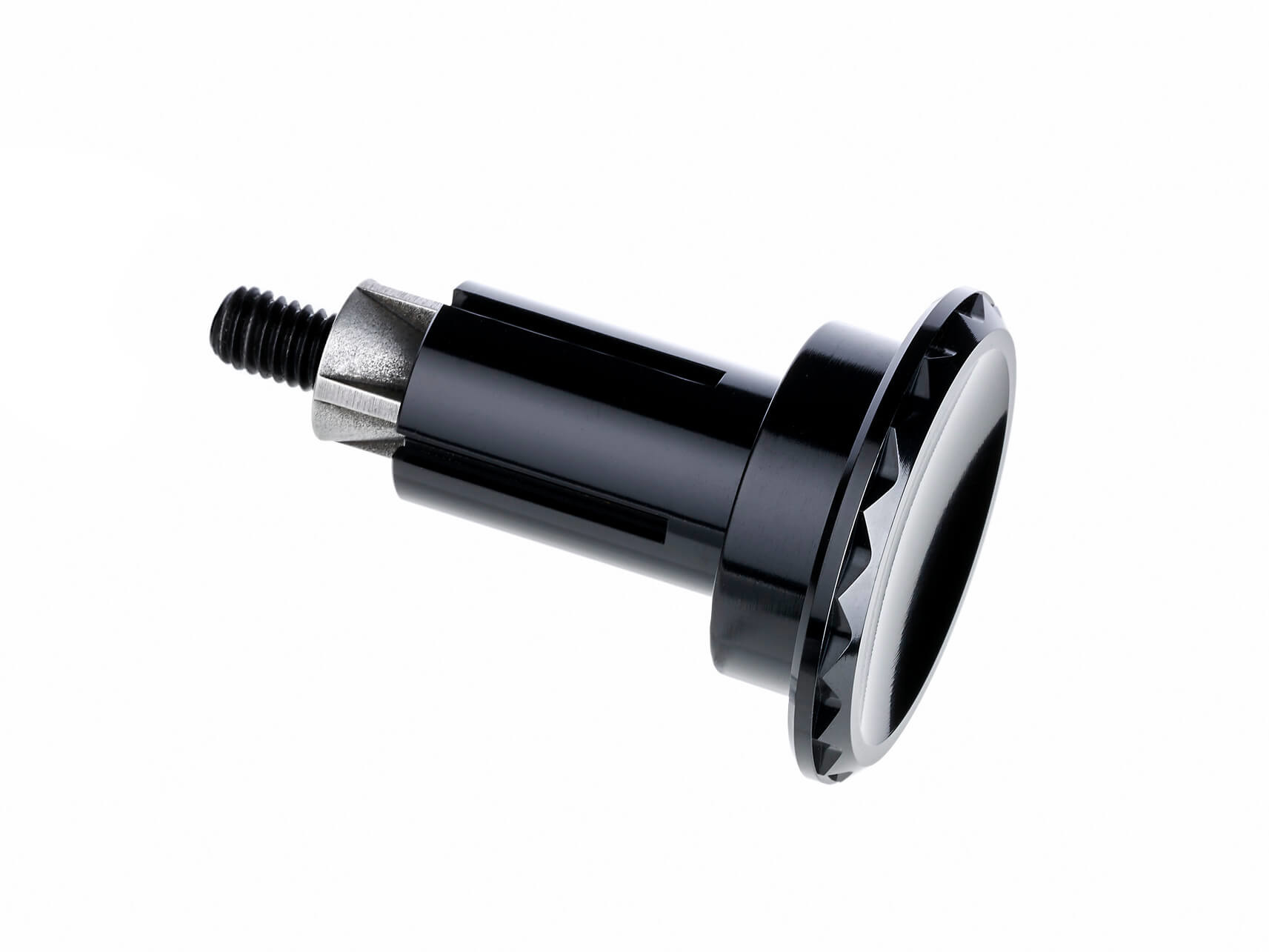 - Es ist schwarz eloxiert und CNC-gefräst aus Billet-Aluminium. Der schraubbare Deckel hat eine konkave Außenseite und ein Kronendesign. Durch das Anziehen einer M6 Schraube unter der Abdeckung, die die Klemmstücke spreizt und eine stabile Montage ermöglicht, wird das Lenkerende geklemmt.