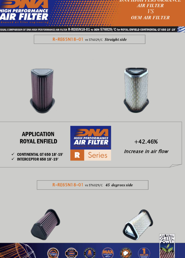 - Der Durchfluss dieses DNA-Filters ist 95,47% höher als beim Royal Enfield-Papierfilter.