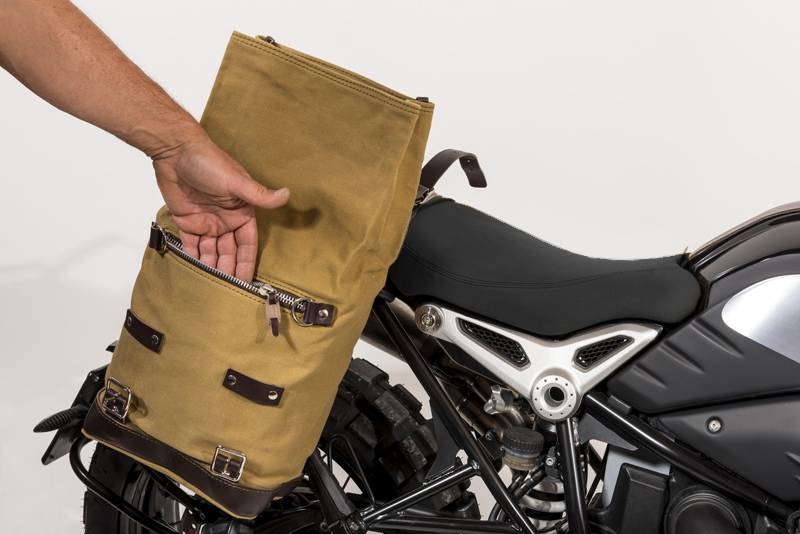 Beige wasserdichtes gewachstes Segeltuch mit brauner Lederausstattung.