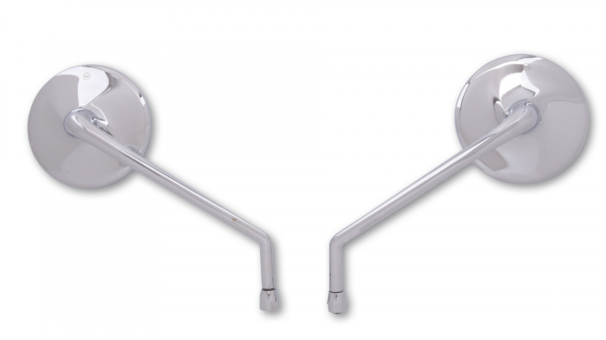 Edler Universalspiegel mit rundem Kopf aus hochwertigem Aluminium, schwarz eloxiert. Der stilisierte Propeller auf der Rückseite des Spiegelkopfes unterstreicht das außergewöhnliche Design dieses Modells. Das leicht getönte und gewölbte Spiegelglas bietet optimalen Blendschutz.