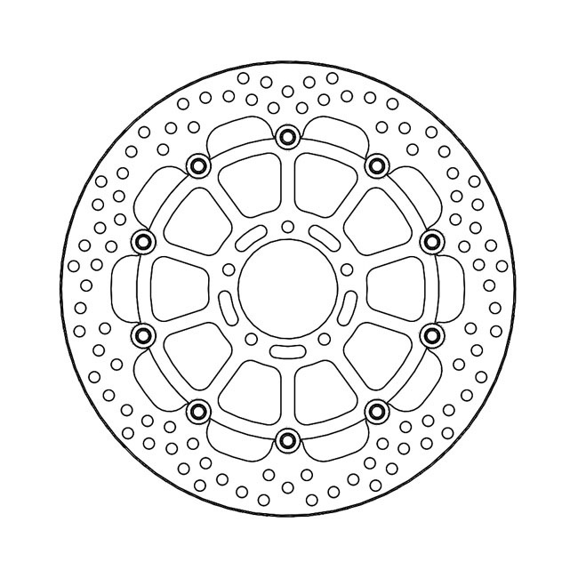 Die Moto-Master HALO-Bremsscheibe verfügt über einen hochwertigen Edelstahl-Außenring, der Hochleistungsbremsen ermöglicht und gleichzeitig extrem langlebig ist. - Die genaue Größe und Position der Entlüftungsöffnungen gewährleistet eine gleichmäßige Wärmeableitung unter hoher thermischer Belastung, während die Bremsbelagkontaktfläche gleichmäßig gereinigt wird. - Der lasergeschnittene und präzisionsgeschliffene Außenring ist an einem CNC-gefrästen Flugzeug-Aluminiumträger aus Billet befestigt, der schwarz eloxiert und laserbeschriftet ist. - Leichte Schwimmer aus Edelstahl. - TÜV genehmigt.