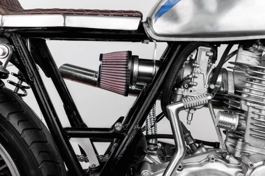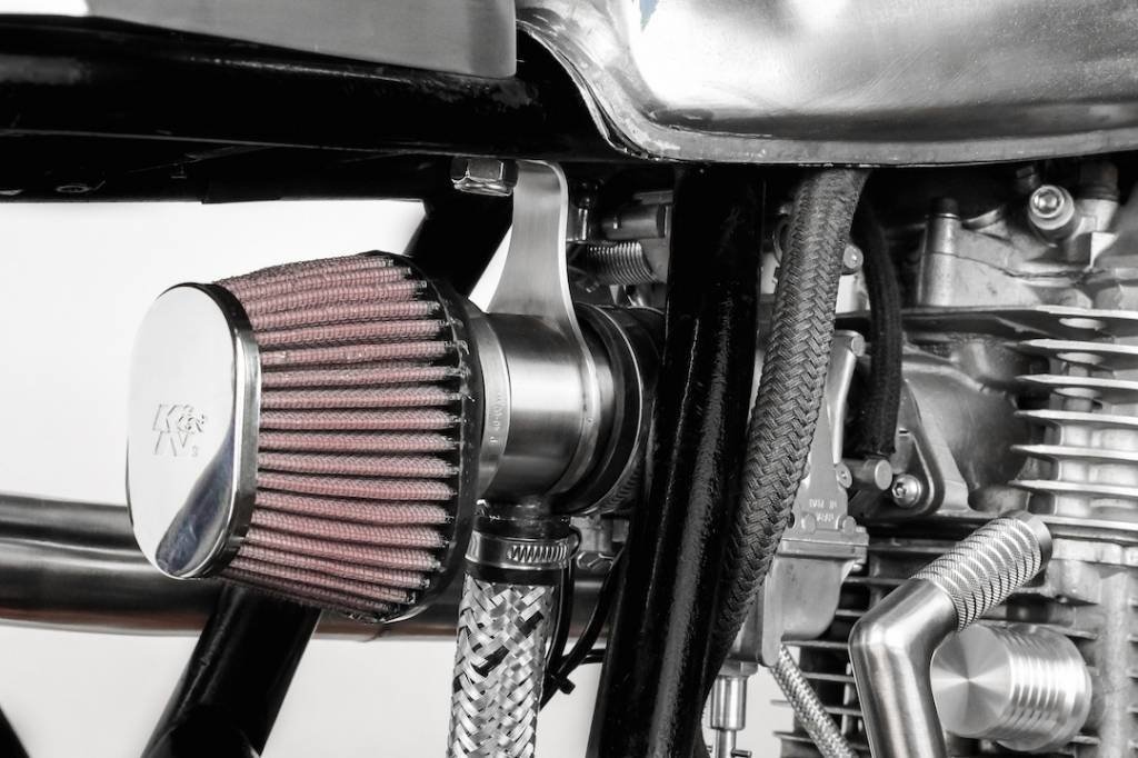 Bei der SR500 2j4 wird der originale Gummiverbinder genutzt, um den Ansaugstutzen zu befestigen. Der alte Ölschlauch wird einfach demontiert und der mitgelieferte Stahlflex-Schlauch mit dem Motor und dem Ansaugstutzen verbunden. Danach wird der Ansaugstutzen über die Halterung und den mitgelieferten Schrauben am Rahmen befestigt.