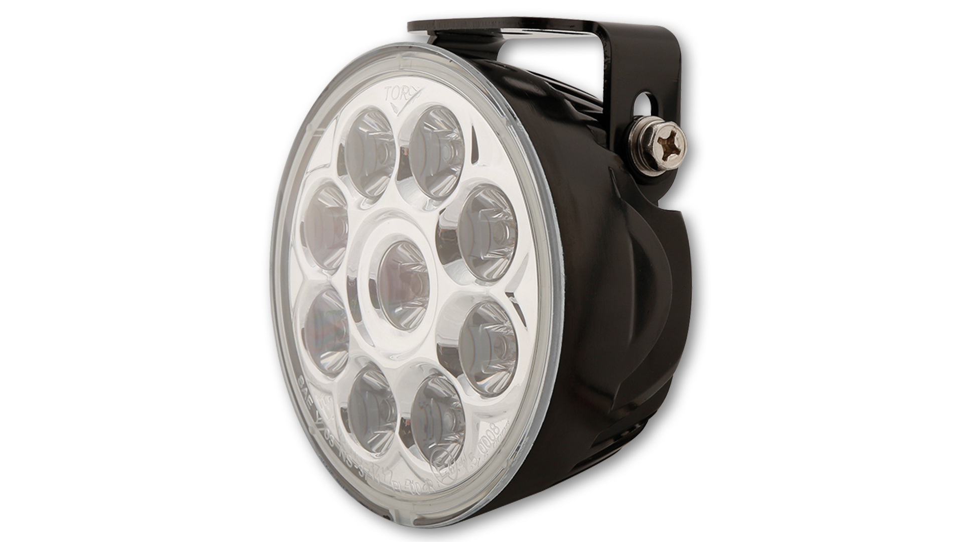 LED spotlight with a round insert and a universal bracket. The spotlight has cooling fins on the back and ablack or chromed reflector. A total of 9 Power-LEDs provide optimal road illumination, E-approved.