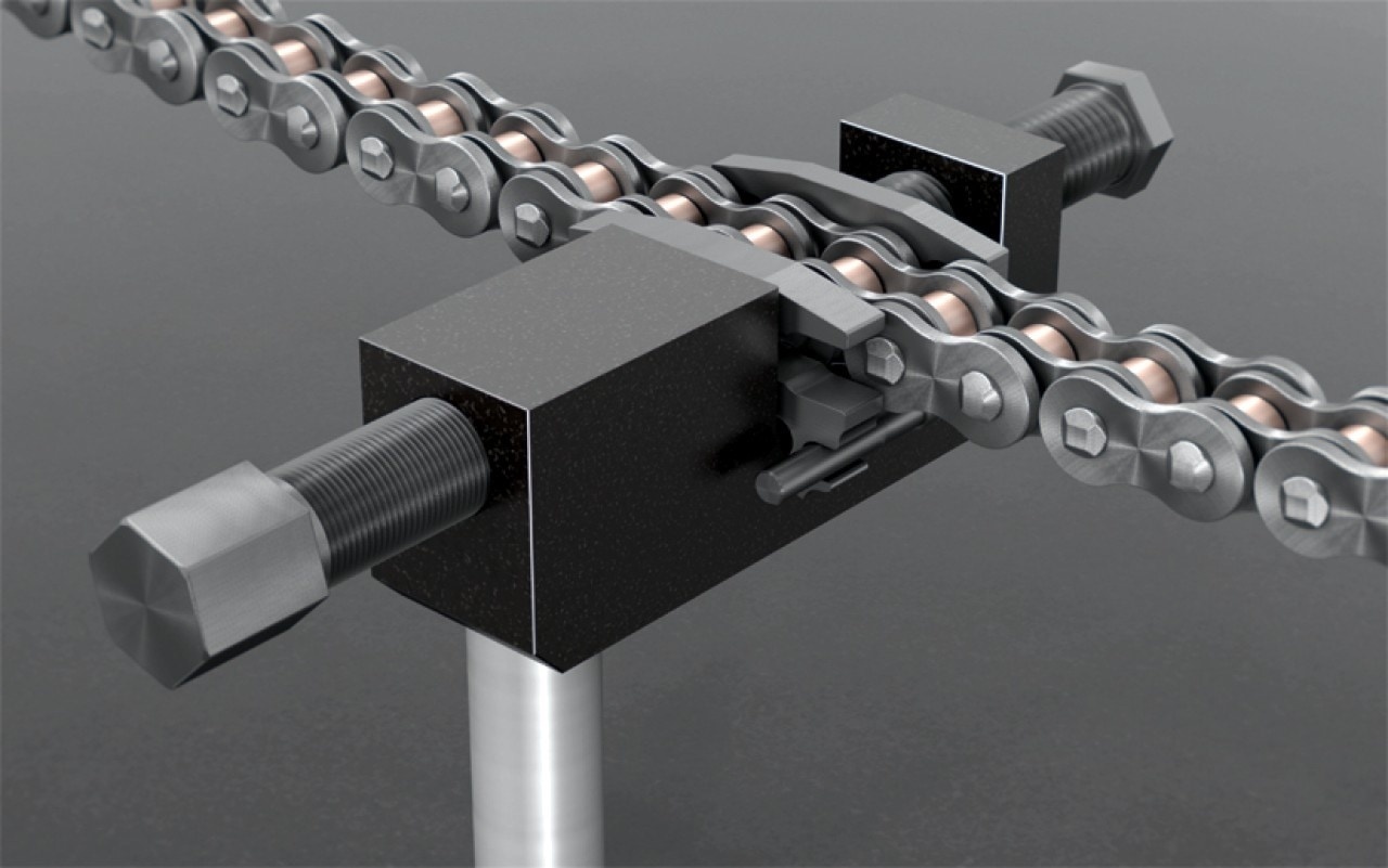 A proprietary, magnetic positioning tool for the connecting link assembly is included with the chain tool, ensuring quick and flawless attachment of the connecting link's side plate. The positioning device is made up of two magnetic plates connected by a guide. The components of the connecting link can be positioned precisely and comfortably thanks to this design. You enjoy hands free operation thanks to the magnetic attachment of the plates to the connecting link. It's essential to avoid pushing the side plate onto the pins too far when assembling the connecting connection.