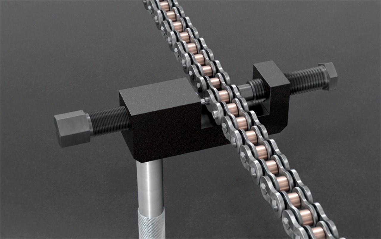 The worn chain may be removed with ease, and the replacement chain can be precisely assembled with hollow rivets so that the swingarm can remain in place. The instrument is made for chains of all brands (such as DID, Regina, RK, etc.). Two arbours for various diameters are now included with the tool. The built-in arbour is now more durable and compatible with both 5xx and 6xx chains. The extra arbour works particularly well with 4xx chains. Only a 19mm ring or socket wrench is needed for use in addition.