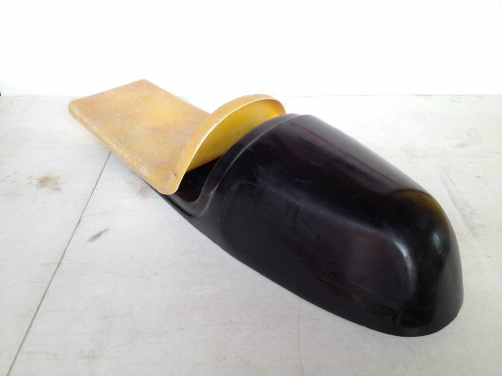 Imola Cafe Racer Seat Type 14. Fibreglass Cafe Racer Seat made in Holland. These seats are very sturdy and this one has a removable part for the upholstery. The colour is just a coating, and we can supply them in black, white, blue and red as well. We give it the colour we like to give that moment.