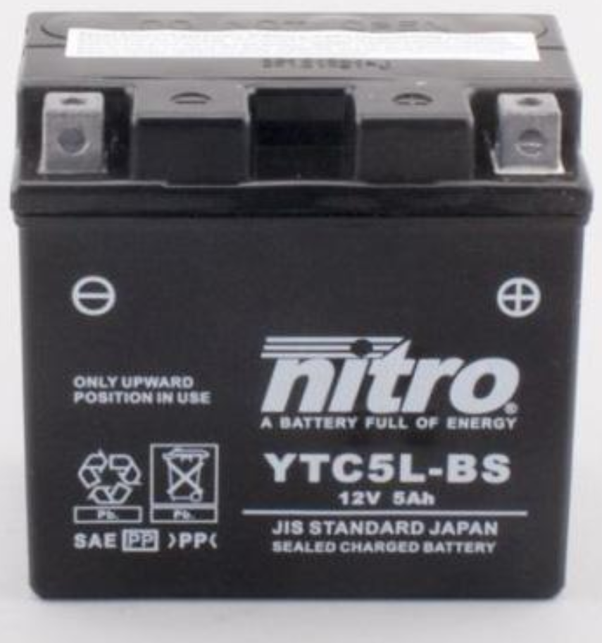 La dernière évolution en matière de batteries est les batteries régulées par valve et chargées par voie humide. Grâce à une technologie très innovante, ces batteries scellées ont une capacité de démarrage plus forte pour un volume de batterie plus petit. Fondamentalement, ces types utilisent la même technologie de recombinaison de gaz avec des vannes de ventilation que les batteries sans entretien, mais la différence la plus importante est que ces batteries sont fournies scellées et déjà remplies d'acide. Grâce à la technologie AGM GEL (Absorbent Glass Matt), ces batteries sont conçues pour une utilisation dans toutes les positions. Modèle YTC5L-BS.
