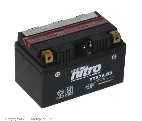 La dernière évolution en matière de batteries est les batteries régulées par valve et chargées par voie humide. Grâce à une technologie très innovante, ces batteries scellées ont une capacité de démarrage plus forte pour un volume de batterie plus petit. Fondamentalement, ces types utilisent la même technologie de recombinaison de gaz avec des vannes de ventilation que les batteries sans entretien, mais la différence la plus importante est que ces batteries sont fournies scellées et déjà remplies d'acide. Grâce à la technologie AGM GEL (Absorbent Glass Matt), ces batteries sont conçues pour une utilisation dans toutes les positions. Modèle YTX7A-BS.