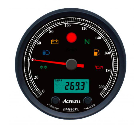 Indicateur de vitesse très complet de Acewell. Il possède une lunette chromée et un cadran blanc. De plus, il possède aussi les fonctions compteur kilométrique et compte-tours. La vitesse est analogique alors que la fonction compte-tours est numérique.