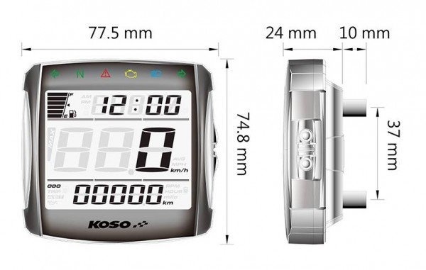 Ce compte-tours homologué est parfait pour les quads, les motos et les scooters. Désormais, les compte-tours Koso sont équipés de fonctions telles la possibilité de changer l'affichage km/h en MPH et/ou de s'adapter à la circonférence de vos pneus. Trois supports additionnels sont disponibles en option afin d'attacher facilement cet instrument à votre véhicule.