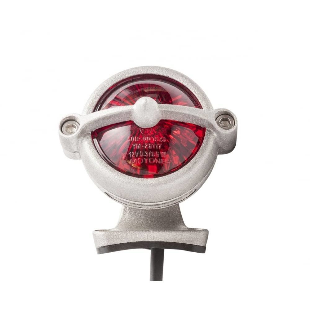 Feu arrière Bel Air et support de garde-boue - Poli. Ce feu fait office de feu arrière, feu de stop et éclairage pour la plaque d'immatriculation grâce à une fenêtre inférieure. Fabriqué en aluminium et avec une finition sablée.