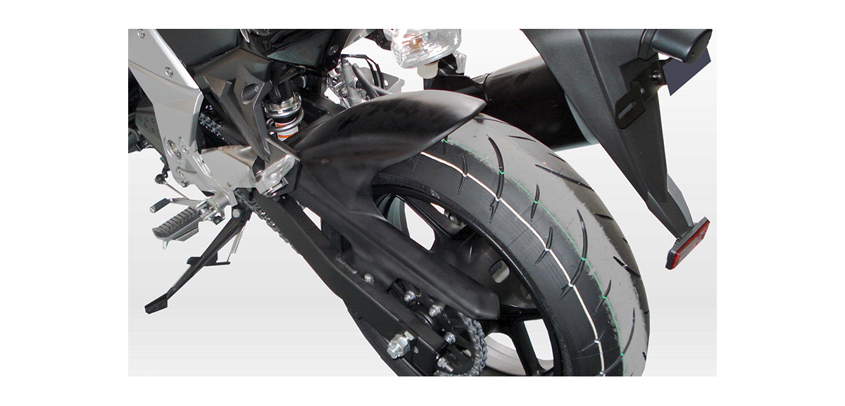 Possède un garde-chaîne intégré. Protège l'amortisseur arrière de la boue et protège également les pieds du conducteur et du passager de l'eau.