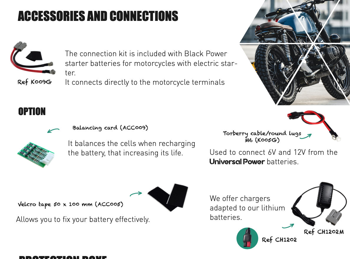 - Une batterie adaptée à tous les modèles : sa petite taille permet de l'installer n'importe où. Son système de connexion permet une adaptation à tous les modèles de pinces - pince positive gauche ou droite, etc.