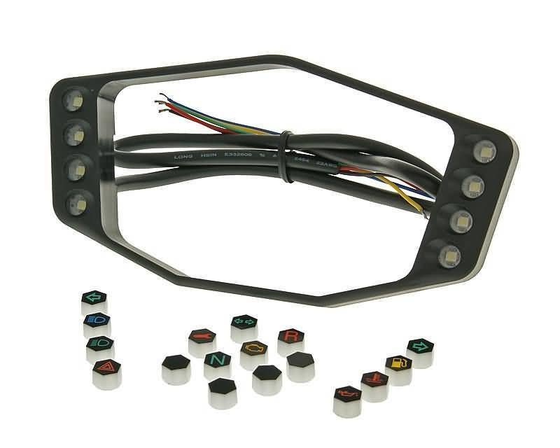 - Comprend huit emplacements pour les indicateurs ! Choisissez parmi douze symboles disponibles : clignotant, clignotant (option 2), feu de route, feu de croisement, carburant, eau, feu de position, marche arrière, moteur, huile, entretien et noir (emplacement vide)