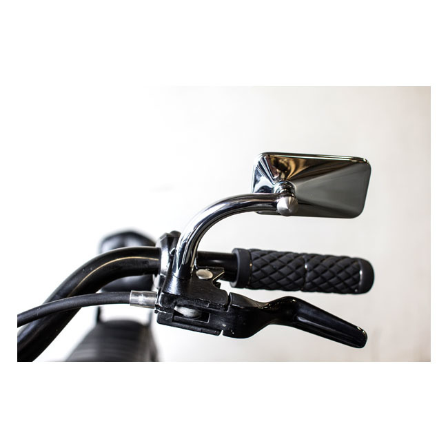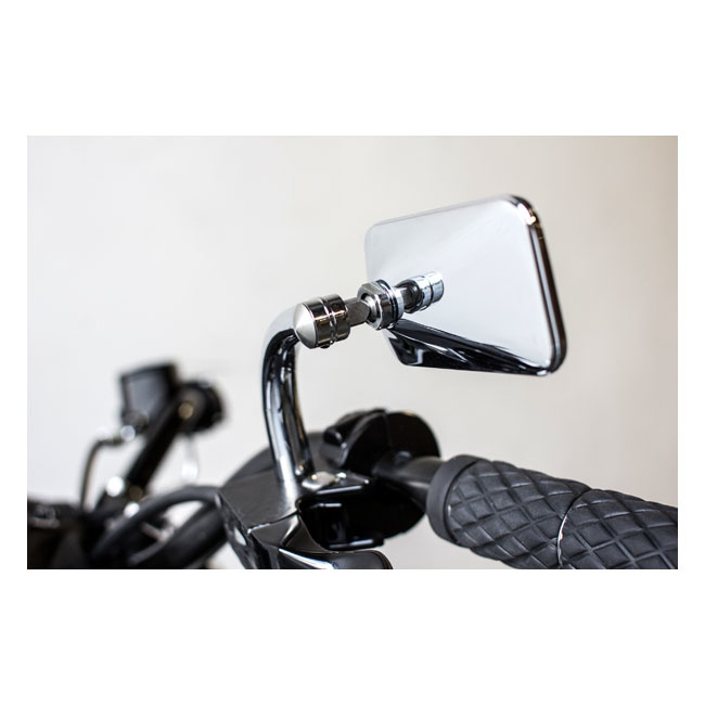 Chrome. Construction en aluminium moulé avec précision et montage à rotule en acier inoxydable. Avec miroir en verre trempé. La base du miroir est filetée 5/16-18 et comprend un boulon allen à capuchon en acier inoxydable. L'assemblage à rotule à l'intérieur du perchoir du miroir peut être inversé pour un montage à droite. Se monte sur une large gamme de commandes manuelles Harley d'origine et sur divers modèles du marché secondaire.