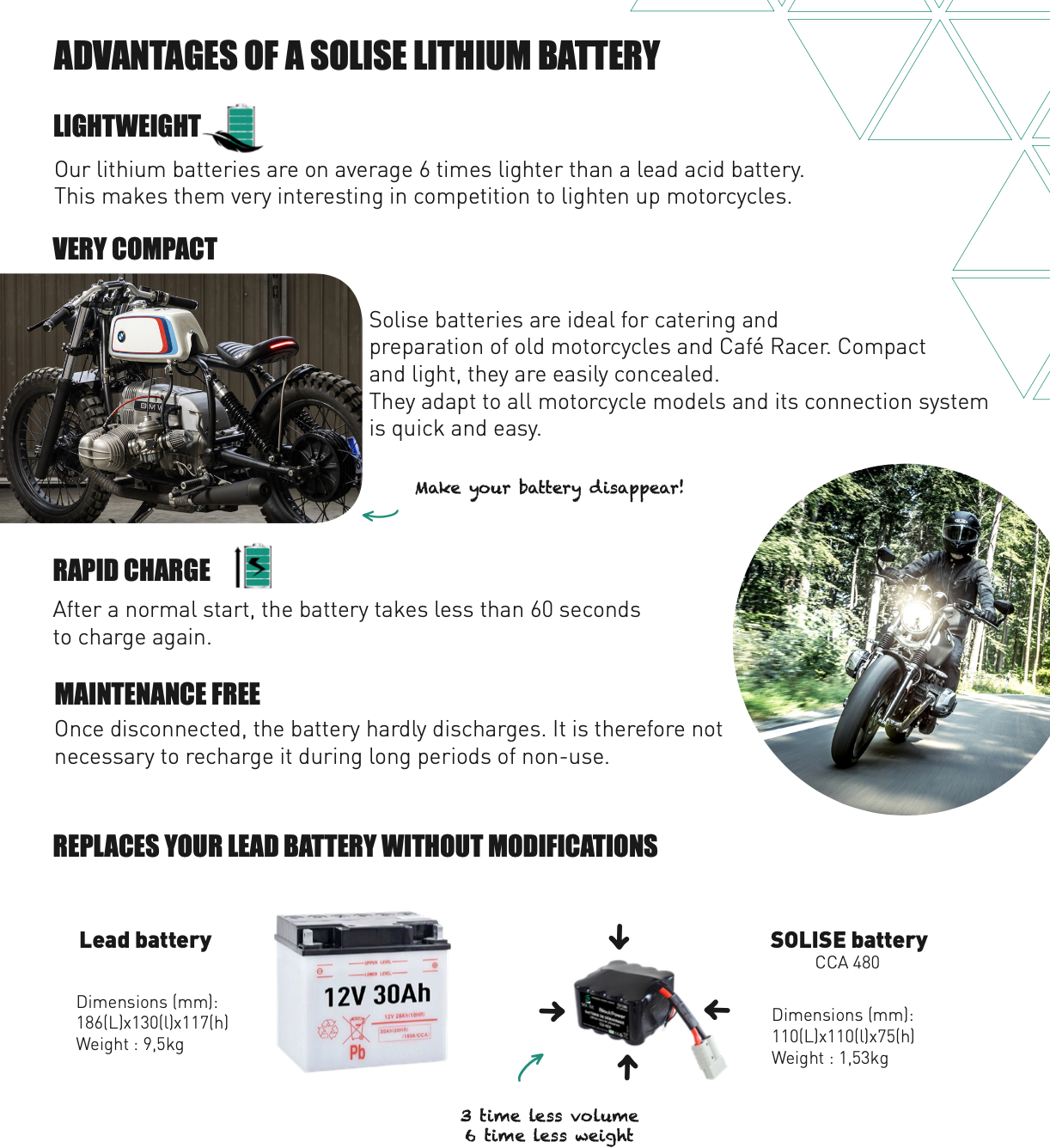 - Un poids plume : en moyenne 6 fois plus légère, cette batterie est utilisée en compétition pour rendre les motos plus légères.