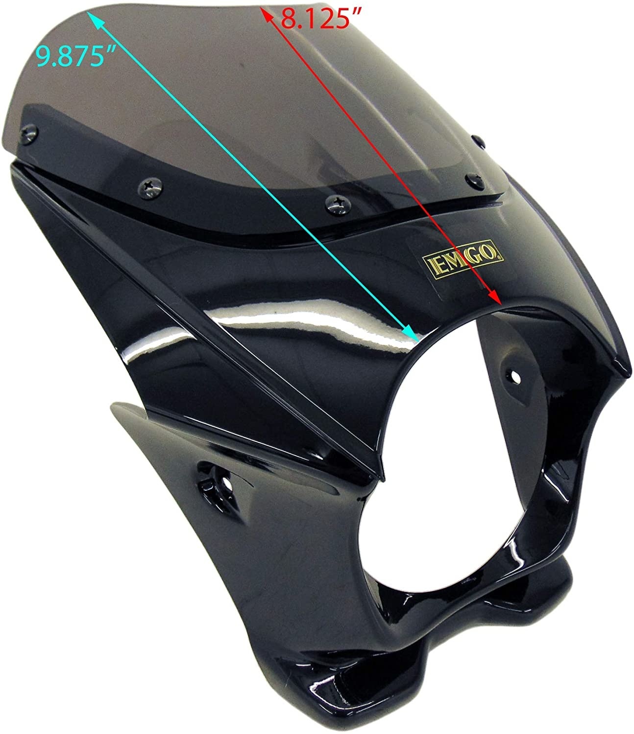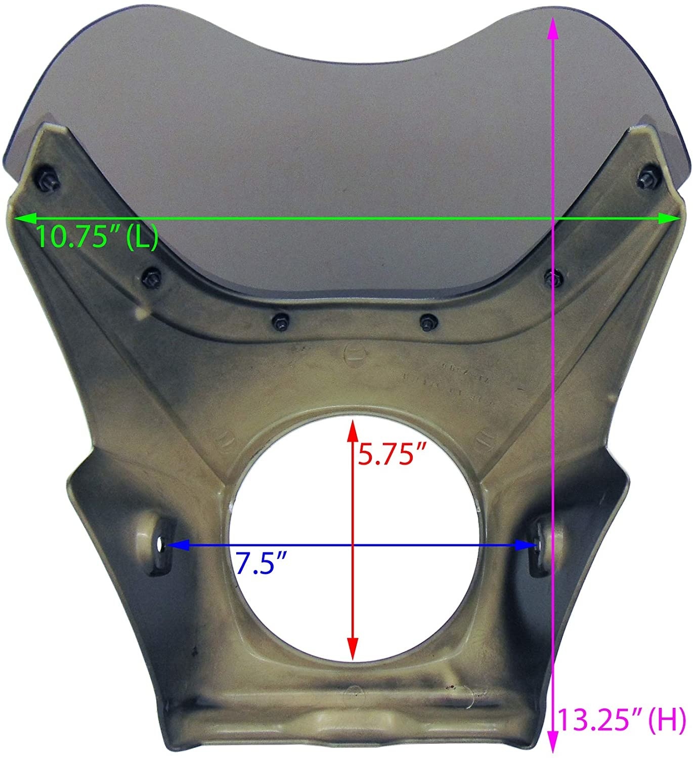 Pare-brise de carénage Mini Cafe pour phares de 5,75 po. Carénage de phare de style café-racer noir brillant. À utiliser avec un phare de 5 3/4 po (14,6 cm) de diamètre. N'inclut pas le matériel de montage. Environ. dimensions: 13-1 / 4 "(33,7 cm) de hauteur hors tout x 10-3 / 4" (27,3 cm) de largeur hors tout. 7-1 / 2 "(19,1 cm) de large entre les trous de montage.