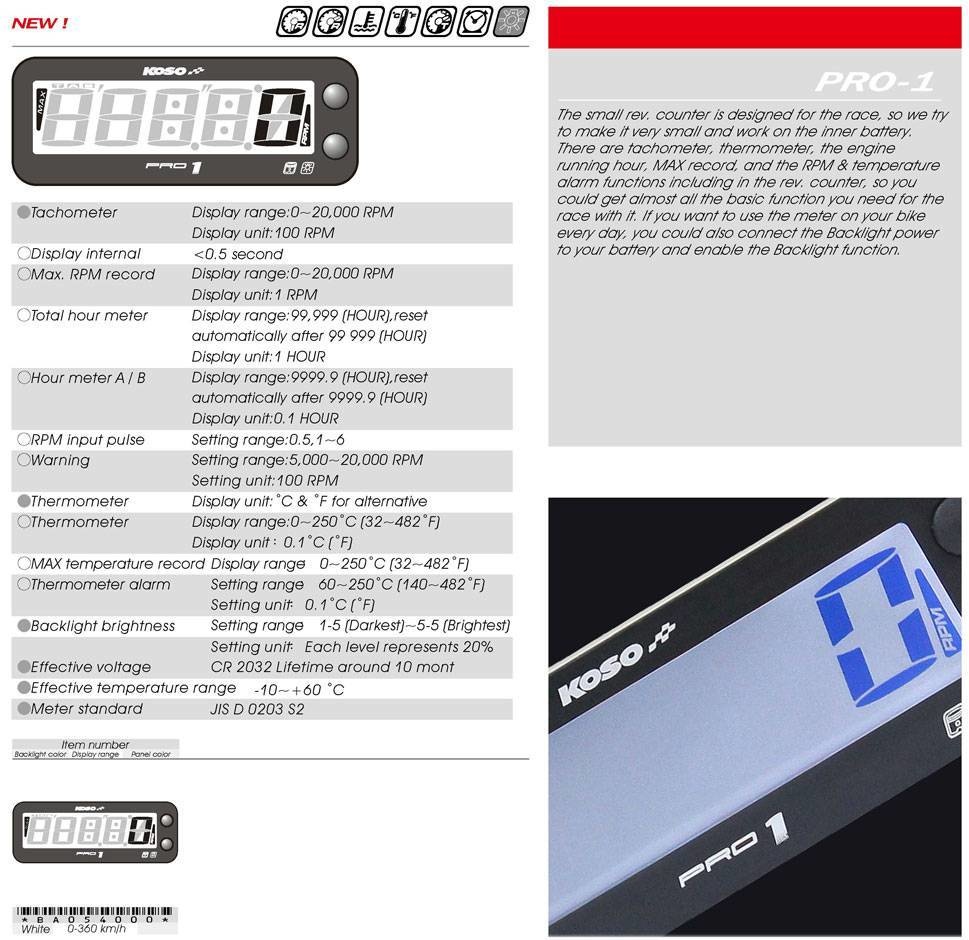 Instrument petit et précis qui détermine le régime actuel de votre véhicule, ainsi que le régime maximum possible avec la batterie interne. Le compte-tours possède aussi un thermomètre, un compteur horaire et une alarme pour la vitesse et la température. Le rétroéclairage est blanc. Si vous voulez monter ce compte-tours sur votre moto de ville, vous pouvez connecter le rétroéclairage à votre batterie.