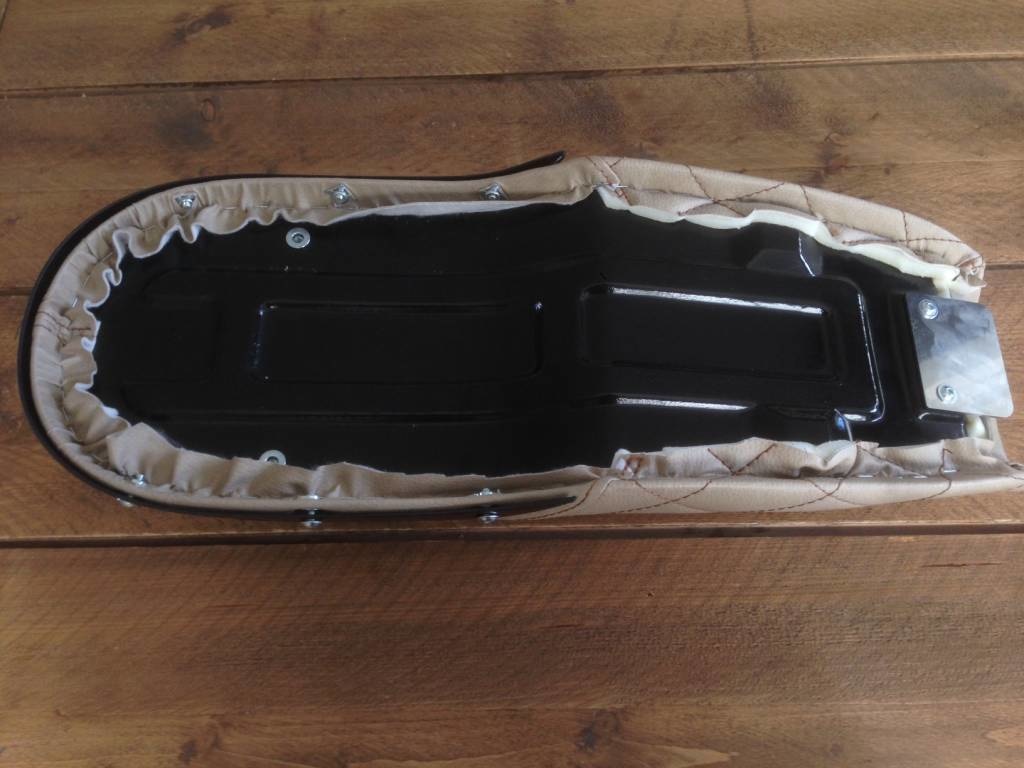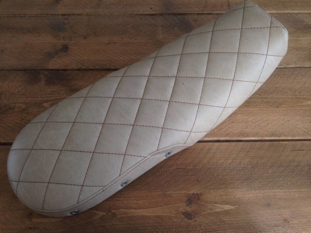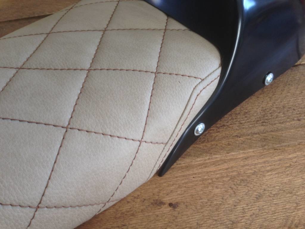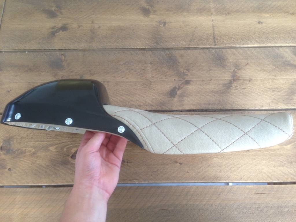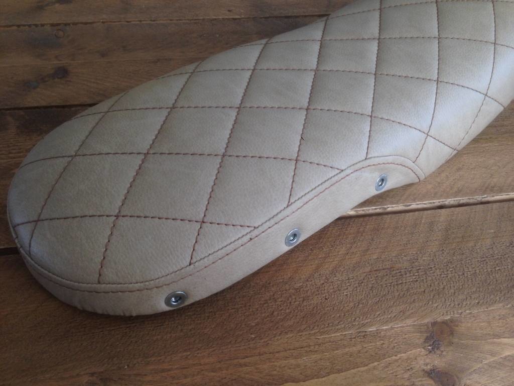 Selle beige CX500 Diamond 75. Cette selle s'attache directement sur votre Honda CX500. Vous pouvez raccourcir un peu votre sous-cadre, mais la courbure de votre sous-cadre ne pose pas de problème !
