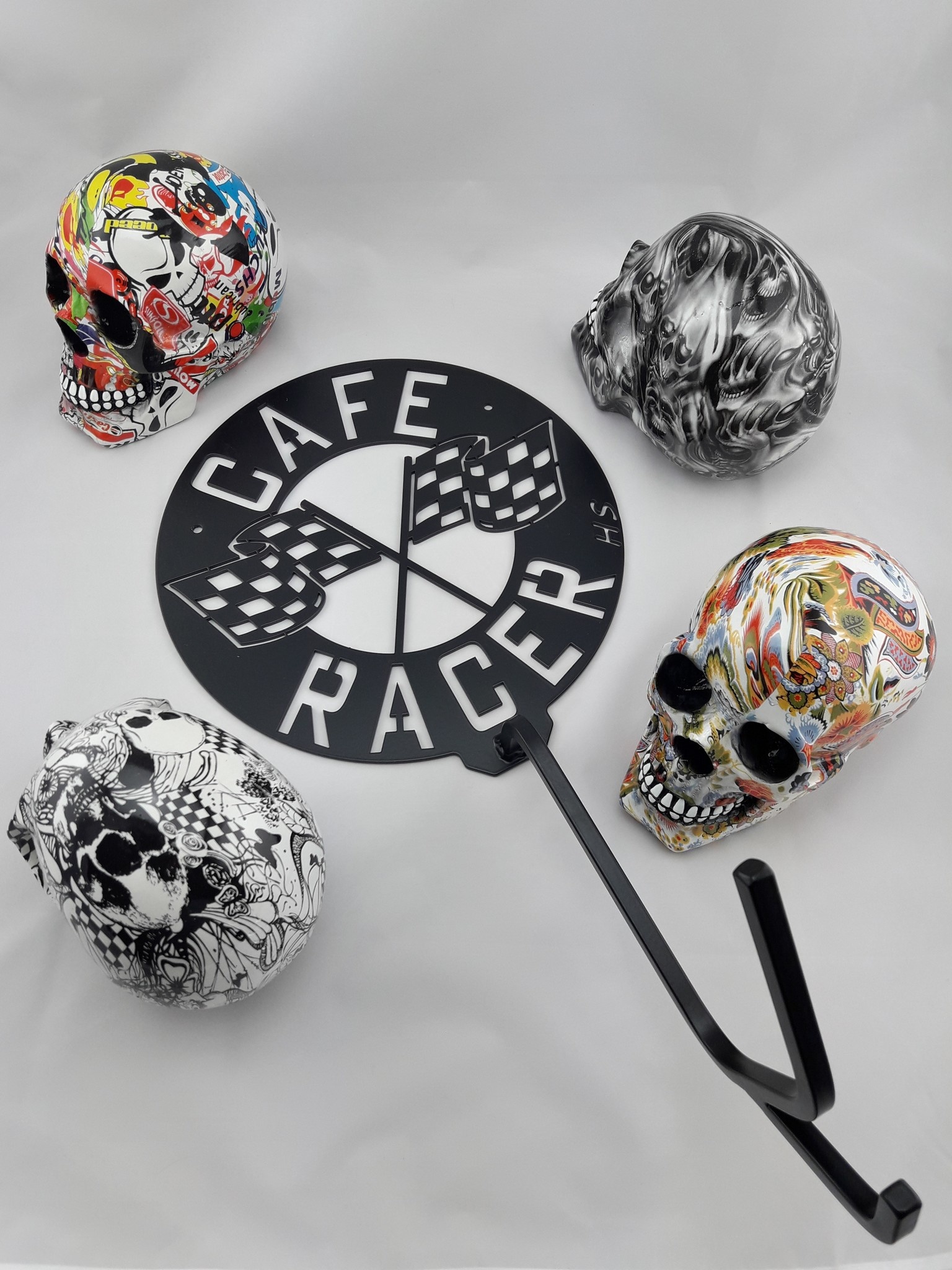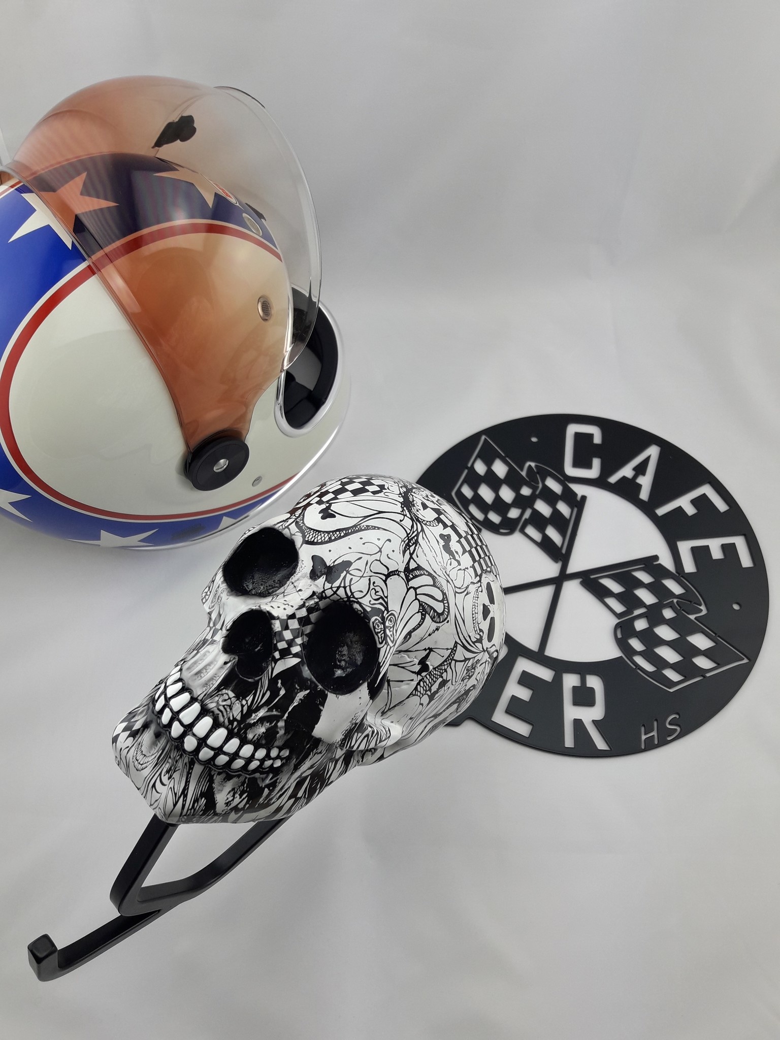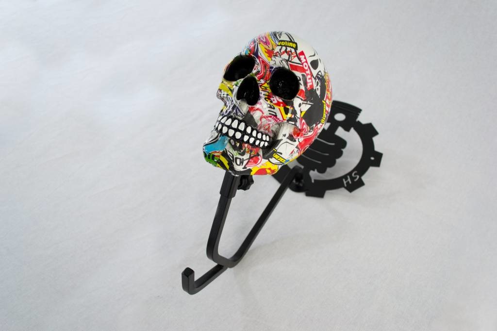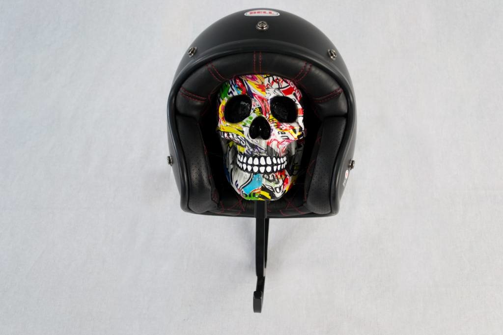 Support de casque "Skull" (divers modèles). Fabriqué à la main, ce produit peut parfois varier quelque peu en apparence. Nous proposons actuellement 2 options : Boom Sticker et Racing Flag.