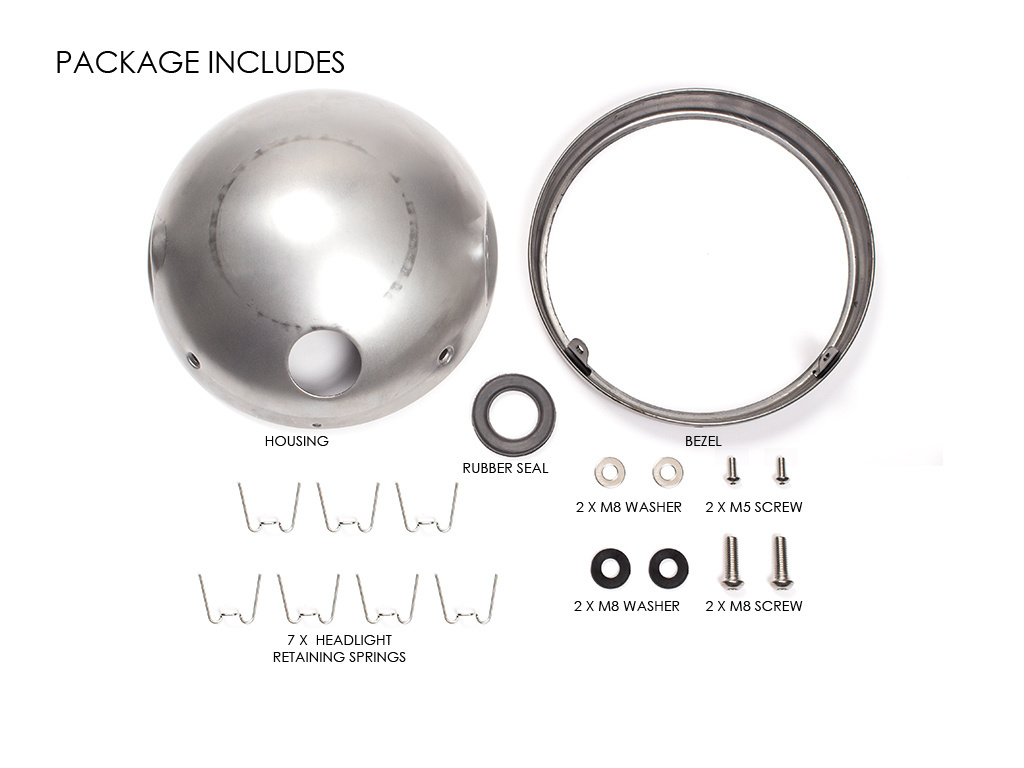 Alles wordt geleverd in deze set, afgezien van de koplamp insert. Elke 7-inch LED-koplamp, verzegelde straal of semi-verzegelde straalkoplampinzet past in deze behuizing en kan op zijn plaats worden bevestigd met de meegeleverde borgveren.