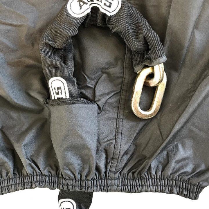 - Ook bij hevige windstoten blijft de hoes goed op de motor zitten dankzij de elastische zoom en de verstelbare riem met kliksluiting.