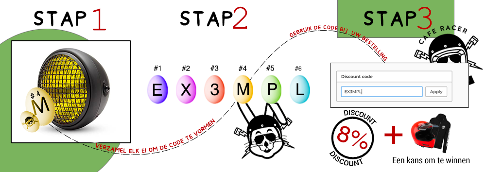 Daarbovenop, als je voor 24/04 de kortingscode gebruikt, maak je automatisch kans op een Peruna Helmet van Roeg en een Caferacer Hoodie met een totale waarde van 300 euro!