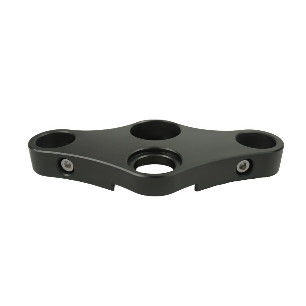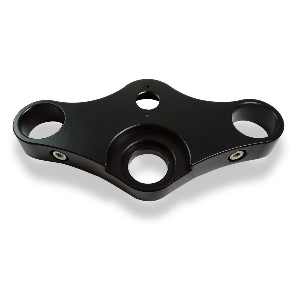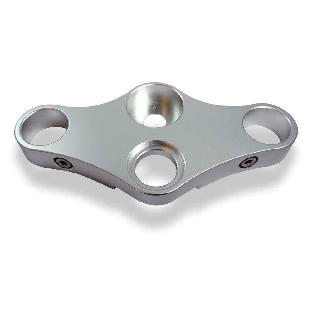 Deze hoogwaardige driedubbele boomklem is CNC-gefreesd uit een stuk aluminium van vliegtuigkwaliteit. Na het bewerken ondergaat de Triple Treeclamp een ​​reeks oppervlaktebehandelingsstappen inclusief anodiseren. Het resultaat is een gladde satijnen afwerking die zowel kras- als weersbestendig is. Perfect voor een café racer motorfiets build of een andere custom build, waar je clip-ons wilt gebruiken.