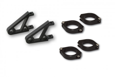 Koplampbeugelset van CNC-gefreesd aluminium. De beugels zijn verstelbaar op de breedte van de koplamp. Indicatoren met een schroef tot M10 kunnen aan de beugel worden gemonteerd. U kunt de gewenste kleminrichting selecteren.