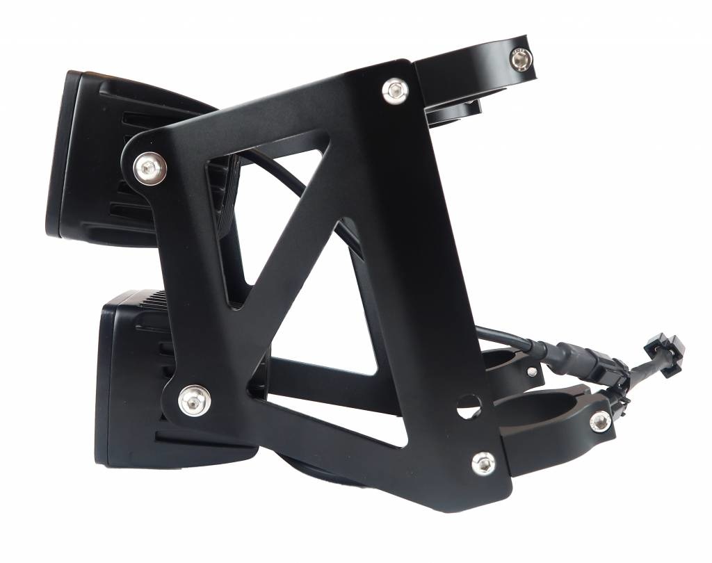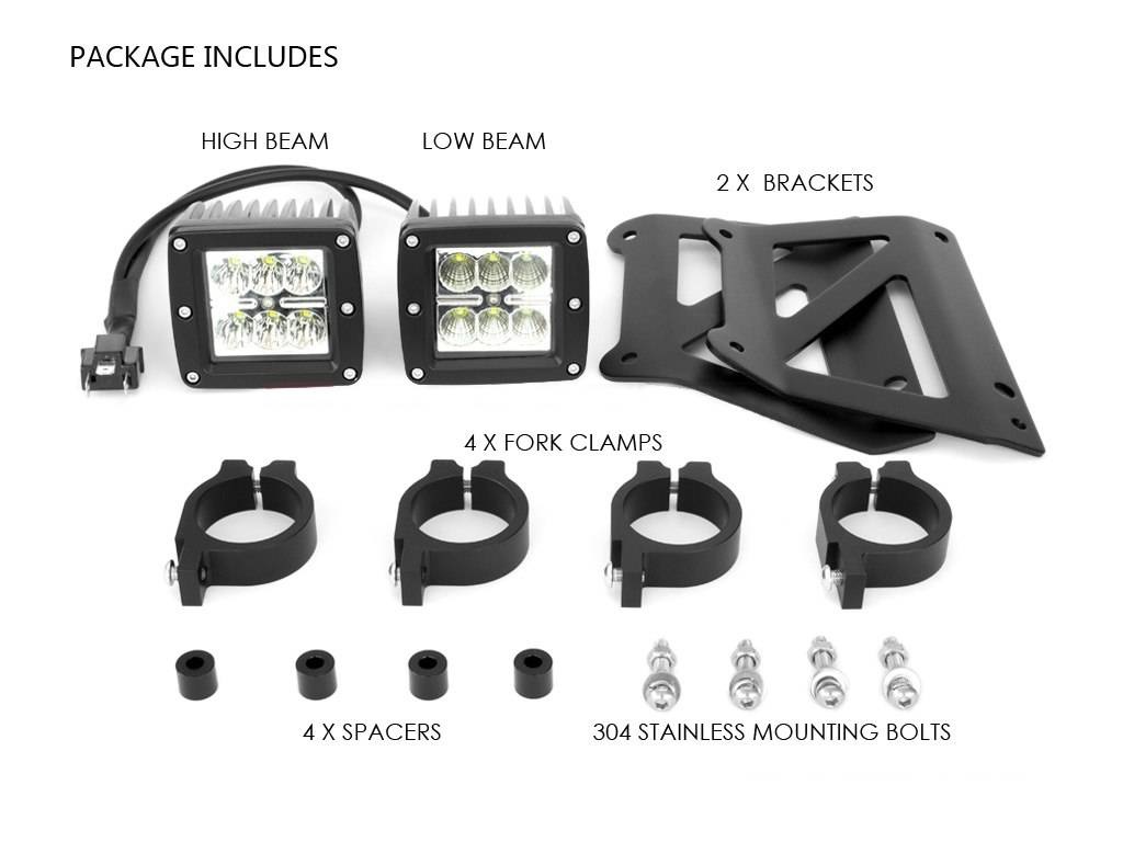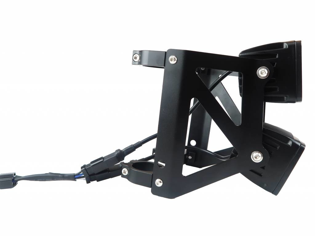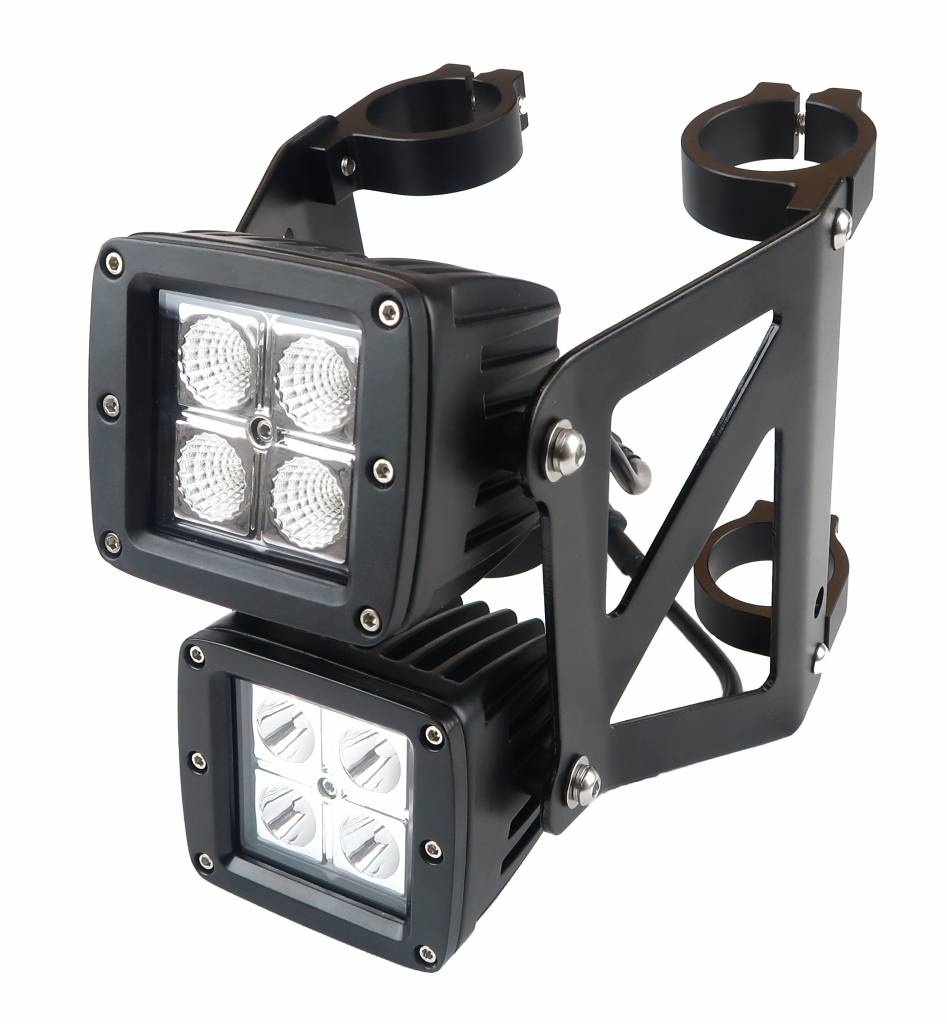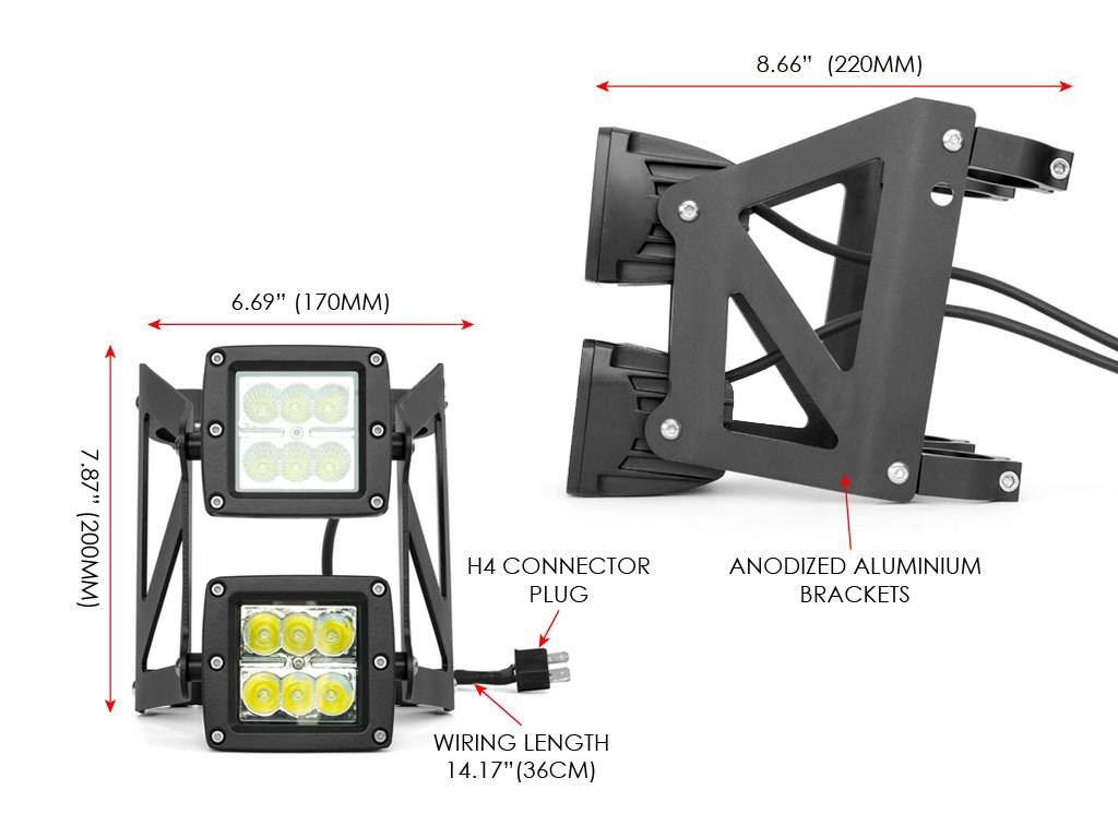 Deze vette Streetfighter koplamp kan eenvoudig op vrijwel elke motorfiets worden gemonteerd. De lichten bestaan uit 2 x 20 watt LED-kubuslampen, met boven het dimlicht en onder het grootlicht. De montagebeugel is gemaakt van geanodiseerd aluminium en heeft 4 vorkbeugels die eenvoudig op uw voorvork past. Een zeer unieke en super heldere koplamp.