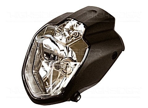 H4-koplamp inclusief voorlicht in Yamaha MT-03-stijl. De koplamp wordt geleverd in een zwarte behuizing voor zijdelingse montage. De reflector genereert een symmetrisch licht voor het beste zicht en een goede zichtbaarheid voor tegenliggers, gemarkeerd met E-markering.