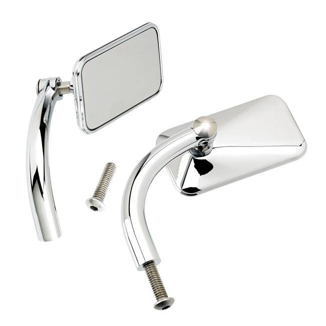 Precisie spuitgegoten aluminium constructie met roestvrijstalen kogelgewricht bevestigingsmateriaal. Spiegel van gehard glas in rechthoekige vorm van 2,5" x 4". Schroefdraad spiegel stengel basis accepteert 5/16-18 roestvrij staal knop dop inbusbout voor eenvoudige montage op een breed scala van voorraad Harley en selecteer aftermarket handbediening.