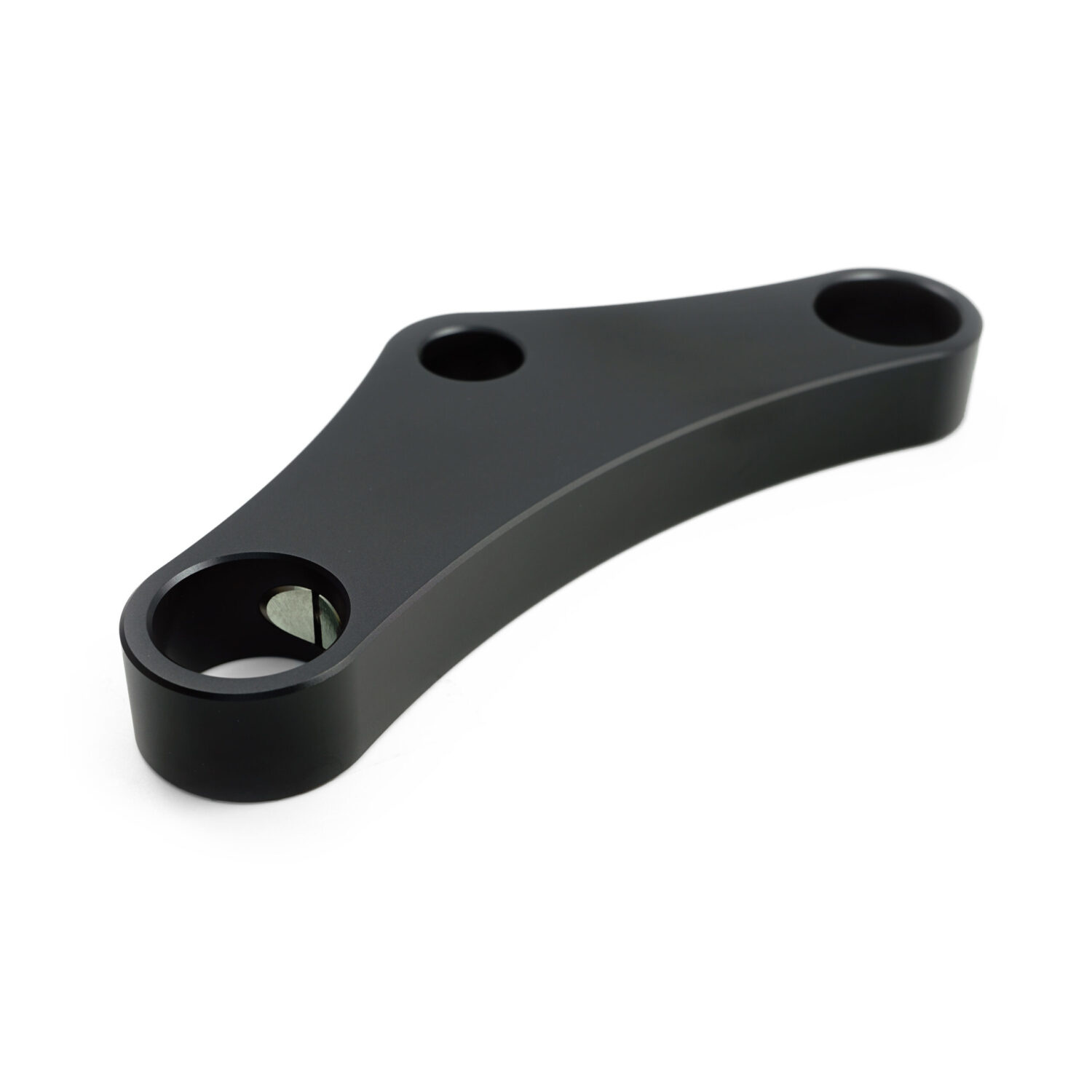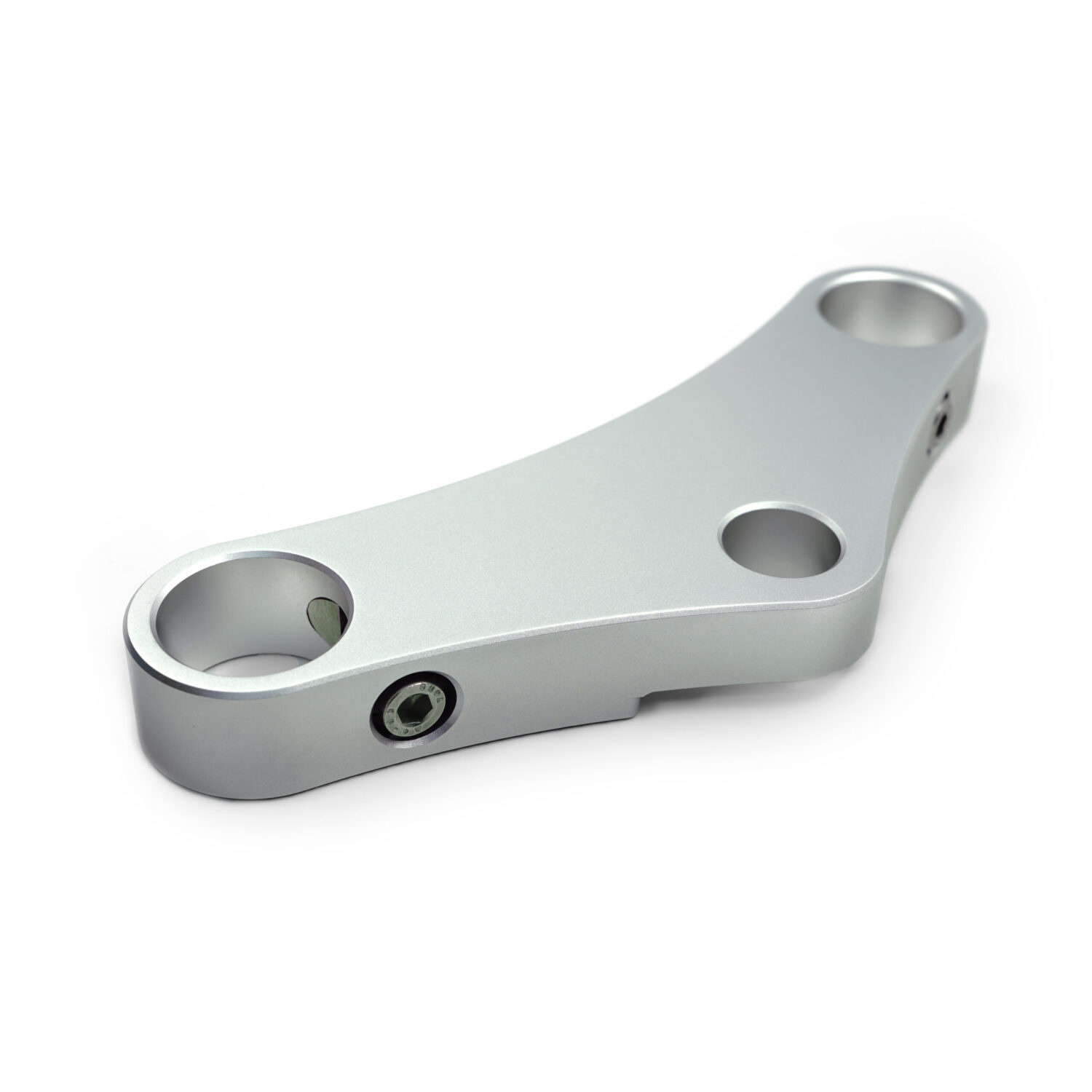 Deze hoogwaardige kroonplaat is CNC-gefreesd uit een enkel stuk hoogwaardig aluminium. Na het bewerken van de kroonplaat ondergaat een reeks oppervlaktebehandelingsstappen inclusief anodiseren. Het resultaat is een gladde satijnen afwerking die zowel kras- als weersbestendig is. Perfect voor een café racer motor build of elke andere custom build, waar je clip-ons wilt gebruiken.