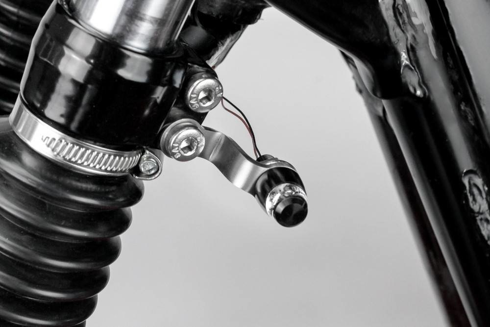 Plug en Play. De richtingaanwijzers met uw richtingaanwijzers worden op de klemschroeven van de onderste vorkbrug geschroefd, gepositioneerd en vastgedraaid.